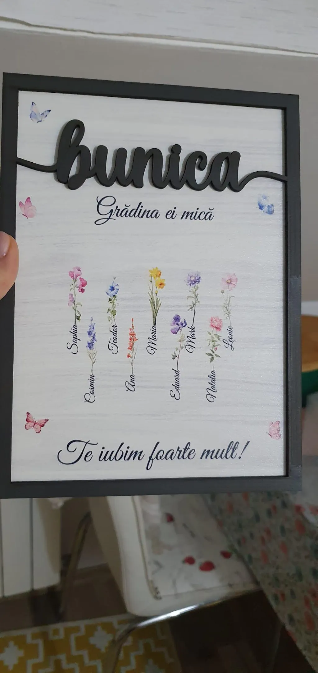 Comanda s-a livrat foarte repede, iar produsele arata ca în poze. Am luat rama cu bunica și gradinaei mica și tricoul cu bunica. Foarte drăguțe.